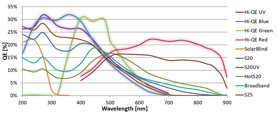 The Hi-QE photocathodes are available in four options, designed to heighten the spectral response across specific wavelengths when compared to broader spectral response photocathodes of S20 and S25. The Hi-QE UV offers superior detection to 330nm, while the Hi-QE blue provides improved response through 400mn.